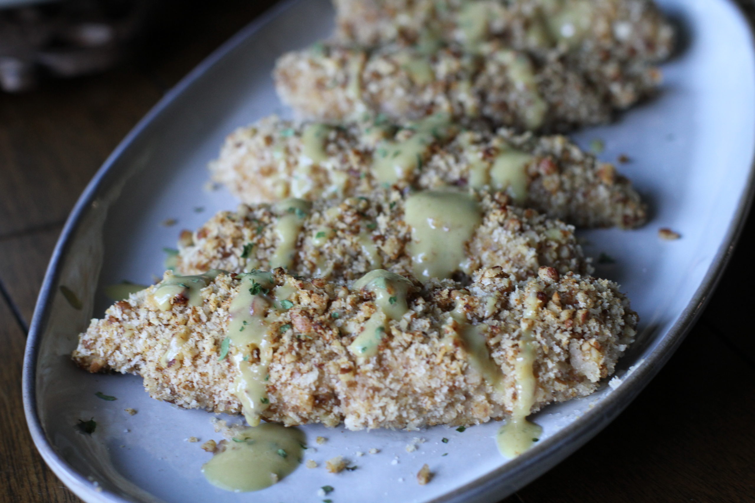 This dish is far from boring, friends. The pecan crust really kicks this up a notch and pairs well with the sweetness of the honey mustard.